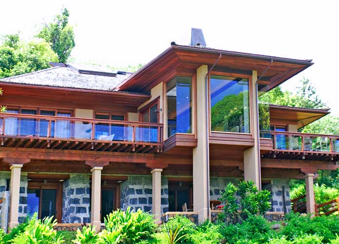 The challenge for this Hawaiian residence located on Kauai was to incorporate an existing stone cistern into the design. The cistern, used as a foundation and basement for the house, had openings cut into it to provide light, air, and access to the basement rooms.