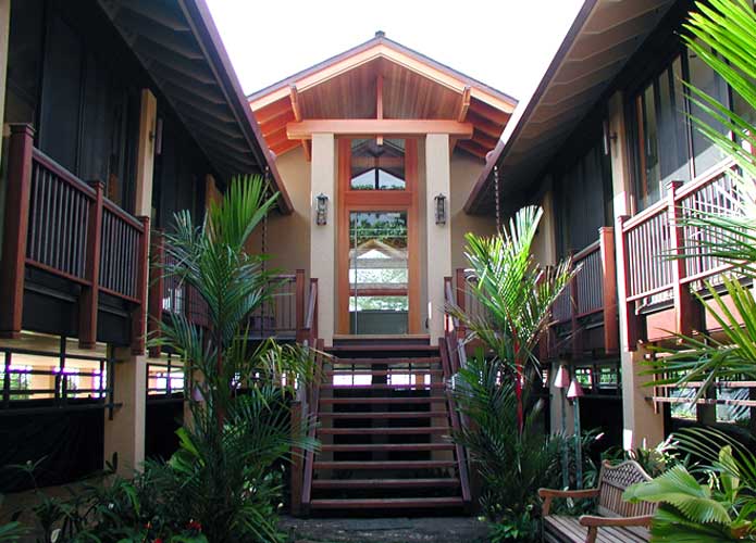 This beach residence was designed for a narrow lot in a flood zone on the north side of Kauai. A long entry courtyard was incorporated into the design to increase the exterior surface area of the walls which capture the ocean breezes for maximum cross ventilation.