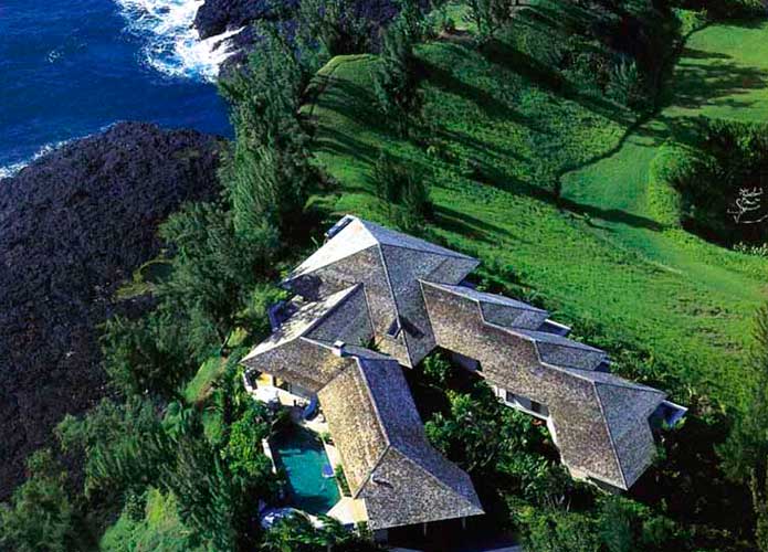 This residence on Kalihiwai Bay was carefully integrated with the natural topography to minimize its impact and to preserve the natural beauty of the site. The pool is tucked into the west side of the house to shelter it from the predominant trade winds from the east. The interior walls, ceiling, and floors are clear hemlock. Corner sliding doors open at 90 degrees to bring the outdoors in.