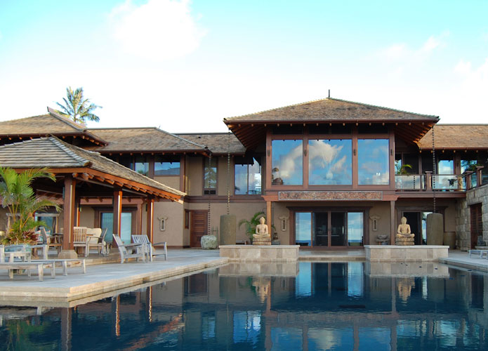 This Balinese style residence was designed primarily as a vacation residence. Carved Balinese doors just off the porte-cochere open to a large walled entry garden. Just inside the gate a foot bridge takes you across a meand-ering koi pond to the entry. The separate master suite is connected to the living areas only by way of an exterior covered bridge with spectacular views towards the ocean and nearby Kilauea Lighthouse.