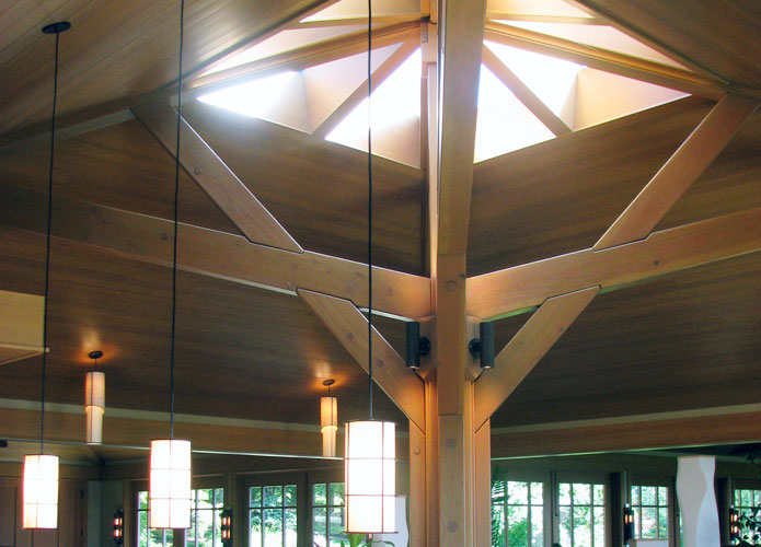 Designed for a car collector, this garage doubles as an entertainment space. Attached to the main house by an enclosed glass breezeway, the space is easily accessible all year round. Glass carriage doors were used to provide maximum light for the space.