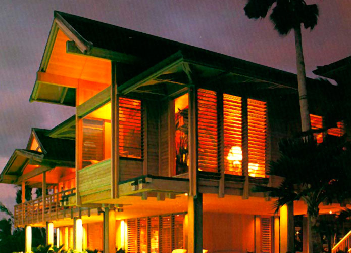 This Thai style residence was built almost entirely out of teak including the exposed scissor trusses. Authentic fish scale clay roof tiles were imported from Thailand to enhance the “Thai” quality. The residence, located in a tsunami flood zone, required the living spaces to be raised 12 feet above the ground. The lower level support spaces were designed with break-away walls. On Kauai, this residence is known as “The Teak House”.